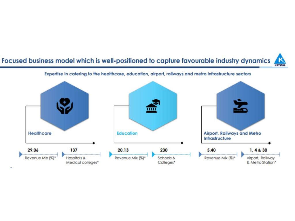 KISL (BSE: 544149; NSE: KRYSTAL), one of India’s leading integrated facilities management services companies, specializes in sectors such as healthcare, education, public administration—including state government entities, municipal bodies, and other government offices—airports, railways, metro infrastructure, and retail. The company offers a comprehensive range of integrated facility management services across these varied sectors. Additionally, KISL provides staffing solutions and payroll management, private security and manned guarding services, and catering services.